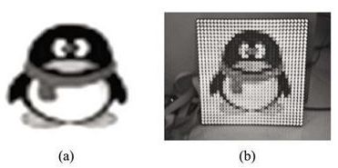 本設(shè)計采用32位嵌入式微處理器STM32F103ZET6和可編程邏輯器件EP1C6Q240C8設(shè)計了全彩色LED顯示屏控制系統(tǒng),并在實驗室驗證,實現(xiàn)了LED顯示屏的彩色顯示,圖6(a)為一幅實際圖像,圖6(b)是在顯示屏上的顯示效果。