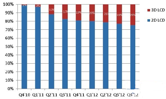 根據(jù)NPD DisplaySearch的調(diào)查,在元旦期間的主要城市賣場(chǎng),3D液晶電視在零售終端滲透率甚至高達(dá)40%;而整體3D液晶電視出貨滲透率可望在2012年第一季超過20%;該機(jī)構(gòu)在全球電視出貨與預(yù)測(cè)季報(bào)(Quarterly Advanced Global TV Shipment and Forecast Report)中預(yù)測(cè),到2012年第四季,中國大陸 3D液晶電視滲透率可達(dá)25%。