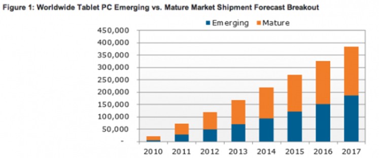雖然那些數(shù)據(jù)本身就已十分驚人,但更令人關(guān)注的是,大多數(shù)新增的銷量將主要來自新興市場(chǎng)。預(yù)計(jì)到2017年,新興市場(chǎng)上平板電腦的銷量所占份額將由2011年的36%上升到到46%。