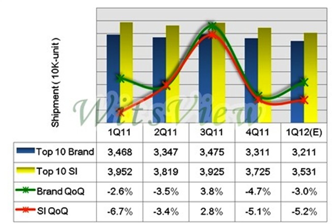 WitsView表示,衰退主因為 2011年第四季部分需求提前于第三季底反應,而終端銷售受到歐洲債信風暴持續發酵,以及全球經濟動能復蘇遲緩的影響,通路拉貨力道無法延續;其次,面板價格雖于第四季止跌,但在終端需求疲軟下,反彈動能受到壓抑,使得品牌及通路商無提前備貨需要;再者,部份2012中國春節需求提前至2011第四季反應,但多數代工及品牌廠考量年底的庫存盤點壓力,而必須進行庫存水位與出貨的調整。