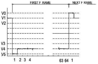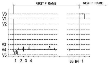 以輸出B形波的芯片的COM線為例。在沒有加電容之前選擇點和半選點的電壓波形都有畸變,畸變嚴重時會造成串擾影響顯示對比度,波形如圖2所示。增加電容后,波形會得到很大的改善,波形如圖3所示。