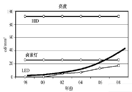 發光效能上, 隨著近年LED 材料結構學的進展,LED 的發光效率也飛速提高。前照燈應用方面,2009 年, 白光LED 的發光效能也已達到70lm /W ( 見圖2 )。而且LED 燈具將絕大部分的能量轉化為光能,作為熱量損失掉的僅是一小部分。據估計, 用LED 取代鹵素燈能提升整車的mpg 指標( 每加侖燃油的行駛英里數) 約0. 25。到歐洲實施白天必須開燈行駛的法規之時, 更可把mpg 提升約0. 5。可見,LED 燈具對整車燃油經濟性的改善將會有很大的貢獻。