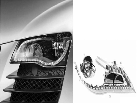 因此,為提高行車安全,越來越多的新技術被逐漸應用到汽車燈具中,如側轉向燈的光纖傳導技術、前照燈AFS 技術等。當然,這其中也包括發光二極管技術( Light Emitting Diode,簡稱LED) 在汽車燈具尤其是在汽車前照燈上的應用。近幾年的汽車設計中,LED 車燈的使用越來越多,給汽車外觀增加現代感的同時,也為更多人所熟悉,并引領當今汽車燈具發展的潮流和方向。