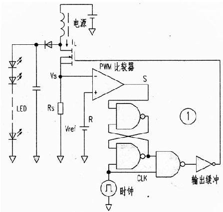 圖1是這種驅動電路的方框圖,它省略了傳統電路的三角波發生器和誤差放大器,而使用了CM0S邏輯IC和PWM調制器。當時鐘CLK信號為低電平時,RS觸發器處于復位狀態,輸出FET關斷。而當CLK信號為高電平時,輸出FET導通。其電流被電阻Rs轉換成電壓,當此電壓高于基準電壓Vref時,比較器輸出由高變低,RS觸發器又被復位,輸出FET再關斷。其結果,即使電源電壓有變化,儲存在電感中的能量卻是恒定的。實現了恒功率輸出。這里是把Rs上的電壓降作為三角波電壓,PWM比較器將此電壓與基準電壓直接比較而起到了誤差放大器的作用。