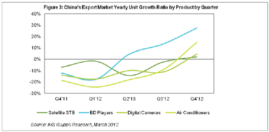 據(jù)IHS iSuppli公司的中國(guó)研究報(bào)告,全球經(jīng)濟(jì)增長(zhǎng)速度低于預(yù)期將在2012年上半年損及中國(guó)消費(fèi)電子出口市場(chǎng),衛(wèi)星機(jī)頂盒(STB)、藍(lán)光光盤(BD)播放器、數(shù)碼相機(jī)和空調(diào)銷售將全面下滑。