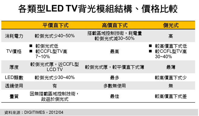 近期南韓TV業(yè)者如三星電子(Samsung Electronics)及樂金電子(LG Electronics)為吸引消費(fèi)者需求,開發(fā)出消耗電力較低、價(jià)格亦較低的直下式LED TV機(jī)種,價(jià)差與CCFL 型LCD TV拉近至10%以內(nèi)。