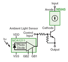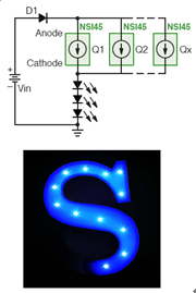 NSI45的另一個典型應用是用作顯示屏和廣告牌文字電路的恒流穩流器線性LED驅動器。其特點包括低啟動電壓,無論正向電壓(Vf)如何變化都可以實現精密穩流,具有負溫度系數特性,可以保護LED。