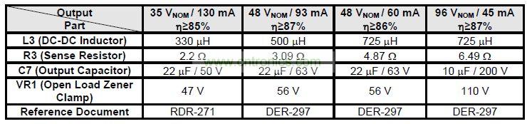 本文介紹采用PI LinkSwitch-PL系列非隔離單級LED驅動器IC設計而成的針對B10型LED燈泡設計的高效率、超緊湊驅動器——DER-297。它的單一恒流輸出功率為4.5W,可輕松配置從35V到100V的輸出電壓,如下表所示。