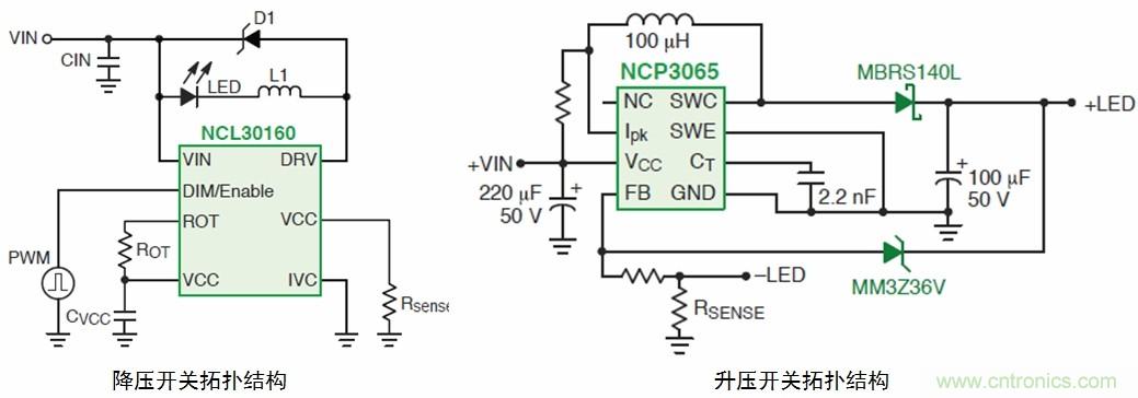 用于中等電壓通用照明的開關(guān)驅(qū)動(dòng)器有多種拓?fù)洌缃祲?、升壓;降?升壓的NCP3065和NCP3066(可以配置為控制器)、NCP3163、MC33163、NCP1294;降壓的CAT4201、NCP1034、NCL30100、NCL30105、NCL30160、NCL30161;此外還有升壓或SEPIC的CS5171/3。