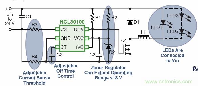 針對(duì)空間及高能效要求的低功率應(yīng)用,安森美半導(dǎo)體提供一款能效高達(dá)95%,又具有自然LED開路保護(hù)的固定關(guān)閉時(shí)間降壓LED驅(qū)動(dòng)器控制器NCL30100。該器件采用準(zhǔn)固定關(guān)閉時(shí)間、峰值電流遲滯控制方法,不要求補(bǔ)償元件;其低邊N-FET開關(guān)拓?fù)溥m合連續(xù)導(dǎo)電模式工作,無須輸出電容;其工作頻率小于500 kHz,±5%典型穩(wěn)流容限,VCC工作電壓范圍為6.35至18 V。