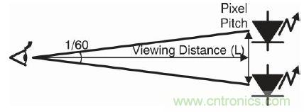 一套LED顯示系統(tǒng)包含大量的LED燈和一個大電源。設計系統(tǒng)時需要重點考慮LED燈的密度優(yōu)化問題。LED 燈的該密度稱為每個像素的距離或像素間距。如果像素間距太密,一旦超出了人眼能識別的精度,它就不會改善影像輸出質量,而且會增加成本。人眼可識別的兩個單光源是在這兩點形成1個弧度的1/60(=1 弧分)時。