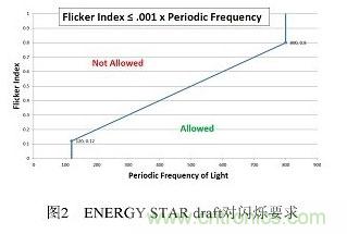 化,人眼到人腦對這一變化產生的主觀反映。通常閃爍按人的感覺分為可見閃爍和不可見閃爍。頻率大于100Hz時,人眼感受不到閃爍現象,但仍會造成眼睛疲勞,頭痛等,這就是頻閃效應。普遍認為500Hz以內都存在該效應。對此,美國能源之星在調光性能的要求中規定了閃爍需滿足的條件,使用于所有燈具。如下圖所示: