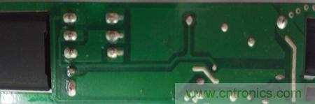 3、輸入輸出線焊盤孔太小、距離PCB板邊太近,也沒有做防拉設計和防堵孔設計,這樣的設計一方面會造成輸入輸出線容易斷裂;另外一方面在生產過波峰焊過程中焊盤容易堵死,后續工序焊接線時需要人工將焊盤孔打開造成浪費生產工時。