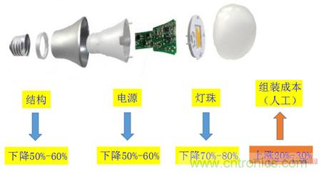 從上圖表示,LED光源產品無論是從結構,電源還是燈珠,成本都有大幅下降至少50%,然而人工組裝成本卻漲幅近20%-30%。晶豐明源銷售總監李寧在第六屆華強國際LED照明市場戰略暨創新技術研討會上表示:“晶豐明源將持續提供更高性價比的整體電源方案來提高客戶的競爭力,其次,實現全自動化生產,提高效率,從而幫助客戶降低人工成本。”