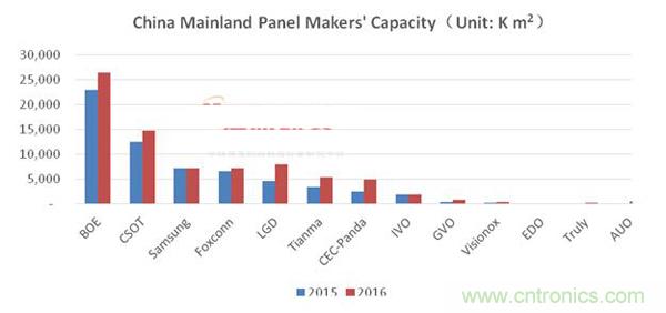 圖二:中國大陸面板廠商2015-2016年產能變化情況