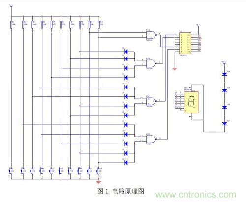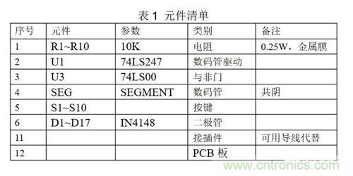如圖1所示,電路由與非門74LS00、數碼管驅動芯片74LS247組成。10個按鍵組成輸入電路,經過與非門電路編碼后,輸入數碼管驅動芯片,驅動數碼管顯示相應的按鍵號。