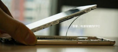 注意音量、電源按鍵的FPC,接口在主板側。按鍵不直接放在主板上還是有點講究的,因為金屬機身遭遇不慎的話可能會變形,而變形后主板與按鍵(鍵帽)之間容易出現錯位從而影響按鍵手感/功能,因此把按鍵整合在后殼上,再用FPC連接主板,怎么摔按鍵也能按。