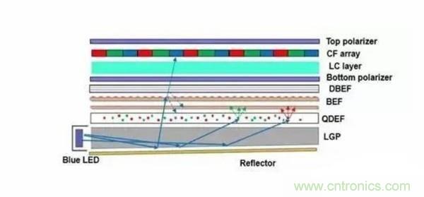 與此同時,QDEF層連擺放位置很計較,為了讓光在層層光學膜中旅行時,重復反射通過QDEF的次數增多,所以QDEF還得放在離光源最近的地方,一但順序往上移,紅綠光的轉換不足,就會造成偏藍的現象。