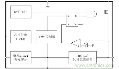 所謂開環,不以檢測到的輸出電流值來做發出PWM信號的參考。所謂的閉環,即真正檢測輸出電流值,以此為標準來發出PWM信號。從電路拓撲上,二者沒有區別。但是在芯片內部對檢測到的如圖1 CS腳電感電流信號,做專利技術處理,如圖2 TRUEC2部分。這樣,就檢測到了電感電流的平均值,也就是輸出電流的平均值。芯片針對檢測到的值,控制輸出占空比,實現了閉環控制。