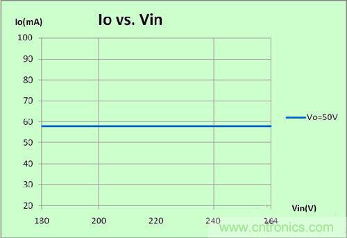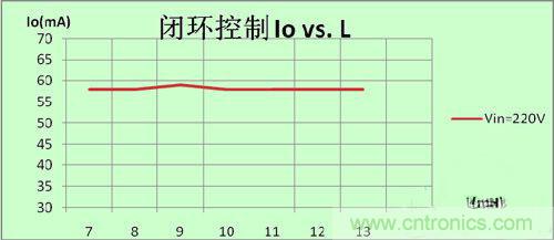 圖4可見,線性調整率為0,因為全閉環控制逐周期精確控制,輸入有任何變化,芯片會馬上檢測到并作相關的調整以便得到同樣的輸出;同理,如圖5及圖6,當輸出電壓變化,電感量變化時,芯片也會作相關的調整;正是因為我們的全閉環高精度恒流控制方法,使電源做到了真正的恒流。這樣,量產的一致性可以控制到小于±1%.