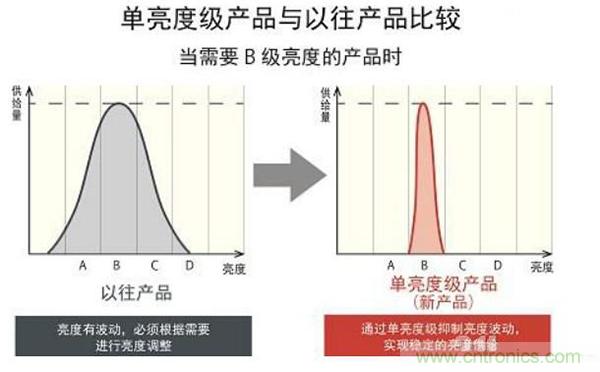單亮度等級: 羅姆將ABCD即紅藍黃白的亮度更細分化,可從一般市場中的赤橙黃綠青藍紫細到17種顏色。