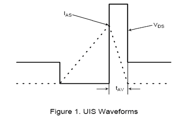 一般評估場效應晶體管的崩潰效應皆以單一脈沖 UIS 為基準。如圖一所示。此方式簡單的定義了幾個針對被測試組件的基本參數。例如在崩潰時間內所流經場效應晶體管的最大峰值電流 (IAS), 在 UIS 開始前的起始接合面溫度 (Tj), 以及崩潰時所經過的時間 tAV 。 將 IAS 及 tAV 所對應出來的圖表曲線可提供使用者了解此組件針對 UIS 的表現能力 , 而提供一個客觀且公正的衡量依據。