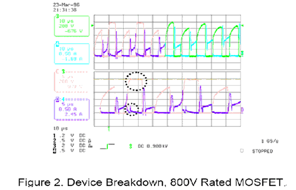 當場效應晶體管進入崩潰效應時 Drain 及 Source 電壓會被嵌制在其崩潰電壓 , 而電流會經由寄生的二極管而產生逆向操作電流的現象。如圖二所示為一典型開關式電源電路所量測到的崩潰現象。從圖中可看出 Drain 及 Source 的電壓 (CH3) 被箝制在 1KV 而且逆向電流 (CH4) 可清楚地被發現。