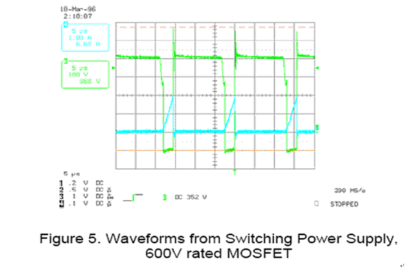 但這里必須提醒一件事 , 圖四所標示的 BVDSS 是基于 250uA 的 ID 電流為條件所定義。在實際崩潰發生時 ID 電流遠大于 uA 的范圍。 因此 , 所欲達到的崩潰電壓也會比上述圖四中所推導的電壓要來的大的多。就實際的考量而言 , 場效應晶體管的實際崩潰電壓一般是額定低電流崩潰電壓的 1.3 倍。以圖五為例 , 它所表示的是一個超過最大額定電壓但并未進入崩潰現象的波形 ,Drain-Source 的電壓已達到 668V > 600V 但并未嵌制于崩潰效應。