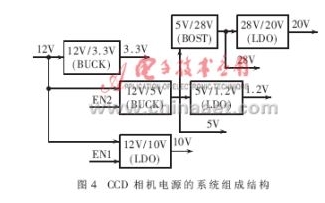 CCD 相機(jī)中的圖像信息的流動(dòng)和變換是通過(guò)相機(jī)中的FPGA/CPLD時(shí)序發(fā)生器的驅(qū)動(dòng)和MCU的控制管理下完成的。整個(gè)CCD相機(jī)正常工作需要以下6種穩(wěn)壓電源,它們的電壓值和最大輸出電流分別是:28V@30mA、20V@50mA、10V@100mA、5V@20mA、3.3V@300mA和1.2V@30mA。
