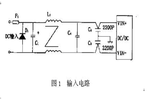用DC/DC轉換模塊設計的二次電源典型輸入電路如圖1所示,主要包括輸入保護電路和濾波電路。