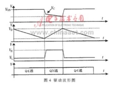 由于加速電容C4的作用,實際工作時,MOSFET的柵-源極輸入脈沖的下降沿非常陡,且又由于柵-源極輸入電容的作用,使VGS 波形具有一定的斜率,這有利于MOSFET的飽和導(dǎo)通。圖4為驅(qū)動波形。