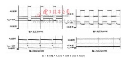 圖5為當(dāng)輸出電壓為10V、電流為2A時,在不同輸入電壓狀態(tài)下,圖3中A點和B點的實測波形。由圖5可知,當(dāng)輸入電壓為13V時,MOSFET關(guān)斷時間很短,當(dāng)輸入電壓為10V時,MOSFET則一直導(dǎo)通。