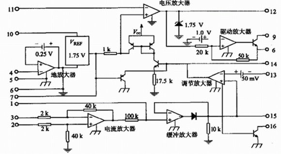 UC3907的內部結構如圖1所示。可分為電壓環與電流環(包括均流控制) 兩部分。其中電壓環由電壓放大器、接地放大器和驅動放大器構成。電流環由電流放大器、緩沖放大器、調節放大器和狀態指示構成。