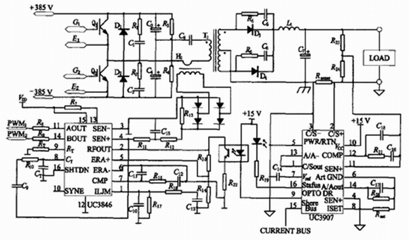 因為電源并聯在一起, 很難達到輸出電流分配均勻, 所以并聯電源模塊間必須采用均流措施。某DC/DC變換器要求: 輸入電壓為385V, 輸出電壓38V, 輸出電流為100A, 必要時多臺開關穩壓電源可以直接并聯使用, 并聯使用時的負載不均衡度小于5%。DC/DC變換器主電路采用半橋式電路拓撲,控制芯片采用TI公司生產的電流控制型PWM集成控制芯片UC3846, 在比較幾種均流控制方案的基礎上, 選擇了根據最大電流自動均流法而設計的UC3907 均流控制芯片, 實現了并聯運行時均流控制。電源模塊在并聯時, 取得較好的均流效果。
