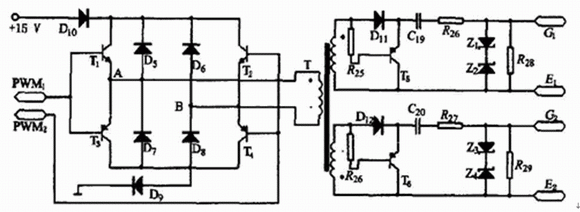 該系統主電路的開關管使用IGBT, 用脈沖變壓器作驅動。當IGBT容量較小時UC3846的11腳和14腳可以直接驅動變壓器; 當IGBT容量較大時, 可以采用圖3所示的驅動電路。該驅動電路結構簡單, 具有負壓關斷能力, 且驅動功率大。電路中, 二極管D9、D10有助于T1~T4的關斷。