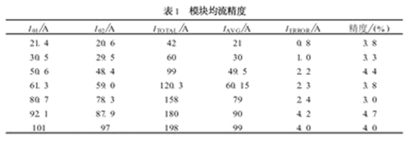 用兩個電源模塊作并聯實驗, 實驗數據見表1所列。由表1知, 它的負載均流精度(負載不平衡度)控制在5%以內。