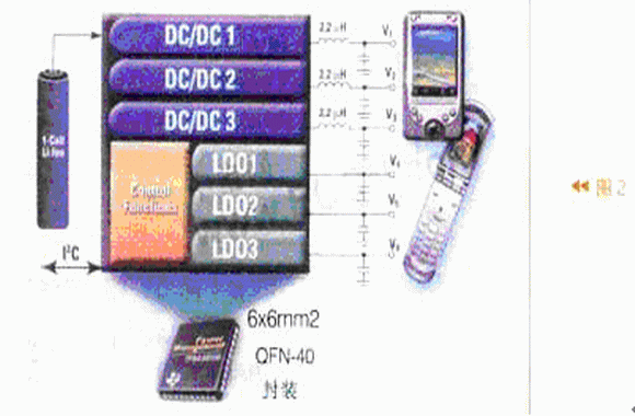 圖2是TI公司的一種電源管理IC(TPS65021)的功能結構示意圖。它由1節(jié)鋰離子電池供電,由微處理器通過I2C與器件接口。TPS65021內部有控制功能電路及6個電源(3個DC/DC轉換器,3個線性穩(wěn)壓器LDO,輸出V1-V6電壓)。它可以給手機供電及實現負載管理。