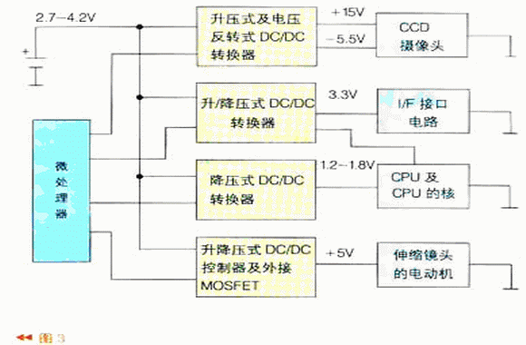 數碼相機中有三種電源:系統電源、LCD電源以及白光LED驅動電源(背光照明及閃光燈電源)。系統電源部分由4個DC/DC轉換器組成,如圖3所示。它分別給CCD攝像頭、I/F接口電路、CPU的核及伸縮鏡頭的電動機供電,通過微處理器可做負載管理,微處理器也可以根據工作狀態(tài)要求來控制LCD背光亮度及閃光燈驅動電路。