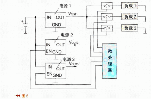 在實際應用中,往往由于電路復雜而采用電源管理IC及多個負載開關組成的負載管理系統,如圖6所示。圖6中有3個電源,輸出不同的電壓。電源1給負載1~3供電。為了控制負載1~3的通電或失電,在電源與負載之間設了3個負載開關。電源2、電源3則由電源管理IC來控制其負載的通電或失電。