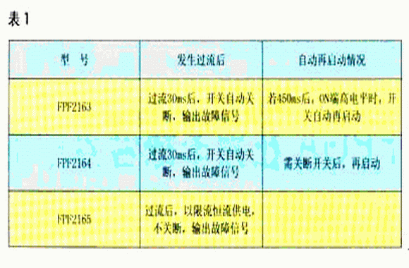 該系列FPF2163、FPF2164、FPF2165在功能上有一些差別,如表1所示。