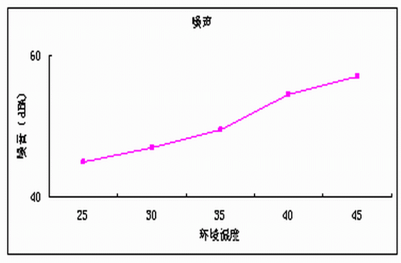 音頻噪聲污染主要控制方法是選用低噪音換熱單元,同時(shí)機(jī)柜采用消音措施。研究表明,換熱單元調(diào)速可有效的降低機(jī)柜噪音。圖5是某型戶外產(chǎn)品噪音水平與環(huán)境溫度關(guān)系曲線,從曲線可看出,采用調(diào)速后,隨著環(huán)境溫度減小,戶外柜噪音明顯降低。由于夜晚時(shí)環(huán)境溫度變低,因此采用該項(xiàng)技術(shù)的設(shè)備晚間有更低的噪音水平,非常符合實(shí)際應(yīng)用環(huán)境的需要。