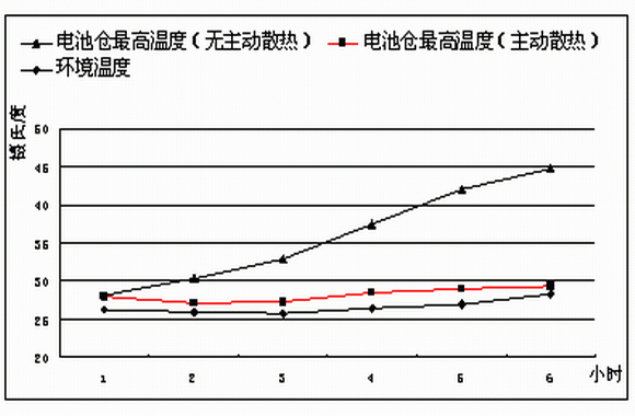 因此戶外電源設(shè)計(jì)中針對(duì)電池倉(cāng)的環(huán)境控制非常關(guān)鍵。尤其在高溫環(huán)境中要有針對(duì)性的散熱措施,研究表明,傳統(tǒng)的自然開(kāi)孔散熱難以滿足電池的應(yīng)用要求。在傳統(tǒng)的自然開(kāi)孔散熱條件下,雖然蓄電池自身發(fā)熱量較小,但隨著環(huán)境溫度的升高,在蓄電池倉(cāng)中的熱累積會(huì)逐步的升高電池倉(cāng)的溫度,在太陽(yáng)照射的條件下情況更為嚴(yán)重。如圖6所示,在自然散熱條件下(倉(cāng)內(nèi)無(wú)主動(dòng)散熱措施),電池倉(cāng)內(nèi)溫度會(huì)遠(yuǎn)高于環(huán)境溫度。在同樣的條件下,采用主動(dòng)散熱技術(shù),電池倉(cāng)內(nèi)溫度基本接近于環(huán)境溫度,電池工作條件會(huì)得到極大改善。根據(jù)此項(xiàng)研究結(jié)果,艾默生開(kāi)發(fā)了電池倉(cāng)獨(dú)立風(fēng)道散熱技術(shù),保證了電池倉(cāng)的充分散熱,極大的改善了電池工作溫度,提高了電池壽命。