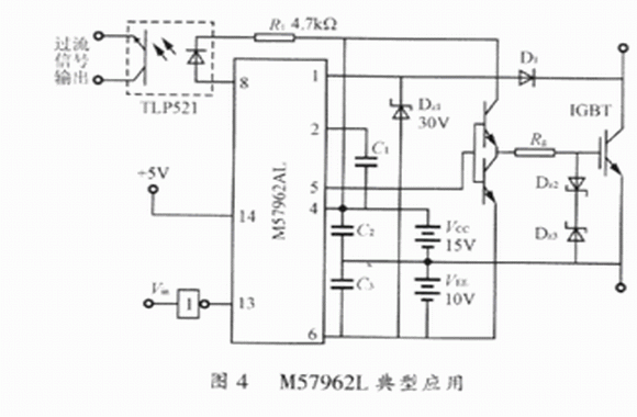 M5796AL具有高速的輸入輸出隔離,絕緣電壓也可達(dá)到AC 2500V/min;輸入電平與TTL電平兼容,適于單片機(jī)控制;內(nèi)部有定時邏輯短路保護(hù)電路,同時具有延時保護(hù)特性;采用雙電源供電方式,相對于EXB84l來說,雖然多使用一個電源.但I(xiàn)GBT可以更可靠地通斷。