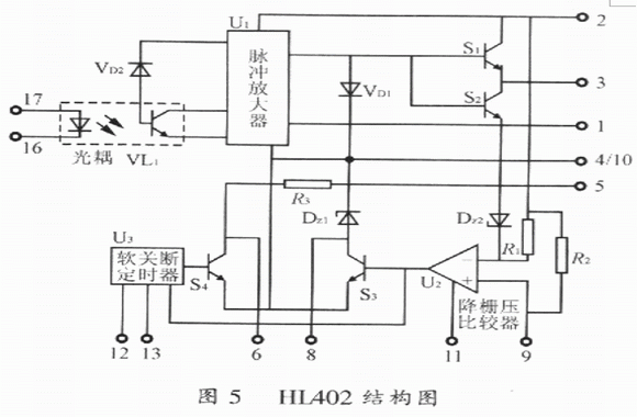 HL402是17腳單列直插式結(jié)構(gòu),內(nèi)置有靜電屏蔽層的高速光耦合器實(shí)現(xiàn)信號隔離,抗干擾能力強(qiáng),響應(yīng)速度快,隔離電壓高。它具有對IGBT進(jìn)行降柵壓、軟關(guān)斷雙重保護(hù)功能,在軟關(guān)斷及降柵壓的同時能輸出報警信號,實(shí)現(xiàn)封鎖脈沖或分?jǐn)嘀骰芈返谋Wo(hù)。它輸出驅(qū)動電壓幅值高,正向驅(qū)動電壓可達(dá)15~17V,負(fù)向偏置電壓可達(dá)10~12V,因而可用來直接驅(qū)動容量為400A/600V及300A/1200V以下的IGBT。