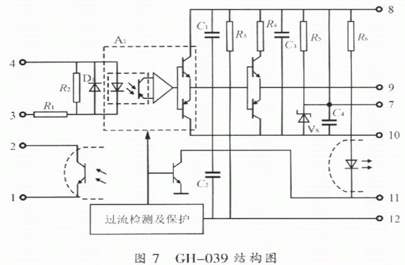 其內(nèi)部結(jié)構(gòu)圖如圖7所示,工作原理與EXB和M57系列模塊相類似,這里不再贅述。而與EXB系列和M57系列的模塊不同的是該模塊已含有保護(hù)后發(fā)送報警或動作信號的光耦合器,所以使用中不需要像EXB和M57系列的模塊外接光耦合器,因而更加方便,其性能比EXB和M57系列的模塊在保護(hù)性能上更加優(yōu)越;在可靠性方面,由于GH-039是單電源供電,不能提供負(fù)偏壓,從而導(dǎo)致ICBT不能可靠地關(guān)斷。與HL402相比,CH-039保護(hù)功能還不完善,它也同EXB841和M57962AL一樣無降柵壓保護(hù)。因此,GH-039驅(qū)動模塊也是有缺陷的。