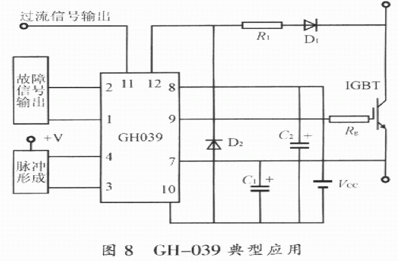 GH-039典型接線圖如圖8所示。工作電源VCC為26V;為了保持電壓穩(wěn)定,濾波電容器應(yīng)盡可能靠近GH一039模塊安裝和使用,且其電容值不能小于10μF,并應(yīng)選用高質(zhì)量的電容;串入GH-039腳12與ICBT集電極之間的二極管D1,應(yīng)選超快速恢復(fù)二極管,并且要保證其反向耐壓不低于ICBT的集電極與柵極之間的額定電壓;為防止所連接的過流保護(hù)端子光電隔離器的誤動作,應(yīng)在D1與GH一039的腳12之間串入100Ω的電阻;接于腳lO與腳12之間的D2選用超快速恢復(fù)二極管,其反向耐壓可以低于IGBT的集射極間耐壓。