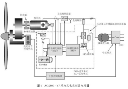 ACS800-67 風力發電變頻器主要和帶有轉子繞組和滑環的感應式發電機一起使用,連接于雙饋發電機轉子和電網之間,電路圖如圖6所示。該變頻器既可以安裝在塔基處也可以安裝于發電機艙內。