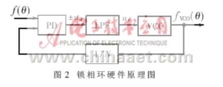 圖1所示的控制環節可以很方便地用鎖相環硬件電路來實現,其原理如圖2所示。圖中,PD為相差比較器,其傳遞函數為:ud=kp•Δθ;VCO為壓控振蕩器,其傳遞函數為