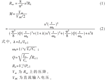 串聯電感Ls、并聯電感Lp和諧振電容Cs組成LLC諧振網絡,在此必須注意到負載也參與了諧振。對其進行建模,LLC簡化模型如圖2(b)所示,Ra c為副邊的負載折算到原邊的等效負載,折算公式見式(1)。因為原邊輸入電壓為方波,電流為近似正弦波,而變壓器輸出電壓也是方波,電流也是正弦波,因此可以推導出其電壓傳遞函數,如式(2)所示。