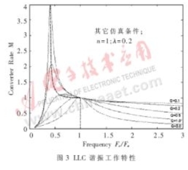 從圖3中可以看到,在整個頻率范圍內,既有降壓的工作區域(M<1),也有升壓的工作區域(M>1),因此LLC諧振有著較為廣闊的應用范圍。在輕負載時,工作頻率逐漸升高,工作在降壓區域內;而在重負載時,工作頻率逐漸降低,工作在升壓區域內。眾所周知,串聯諧振的工作區域是Fs/Fo>1,才能工作在ZVS的狀態下。從圖3中可以看到,在不同負載(即Q不同)下,為獲得ZVS的工作條件,只要使之工作在虛線的右側即可。而LLC諧振不僅僅局限于Fs/Fo>1區域,在某些負載下可以工作在Fs/Fo<1區域,同樣可以獲得零電壓轉換的工作狀況。并且與串聯諧振相比,在不同負載時的頻率變化范圍更小。因此,LLC諧振網絡有著其自身獨特的優點。